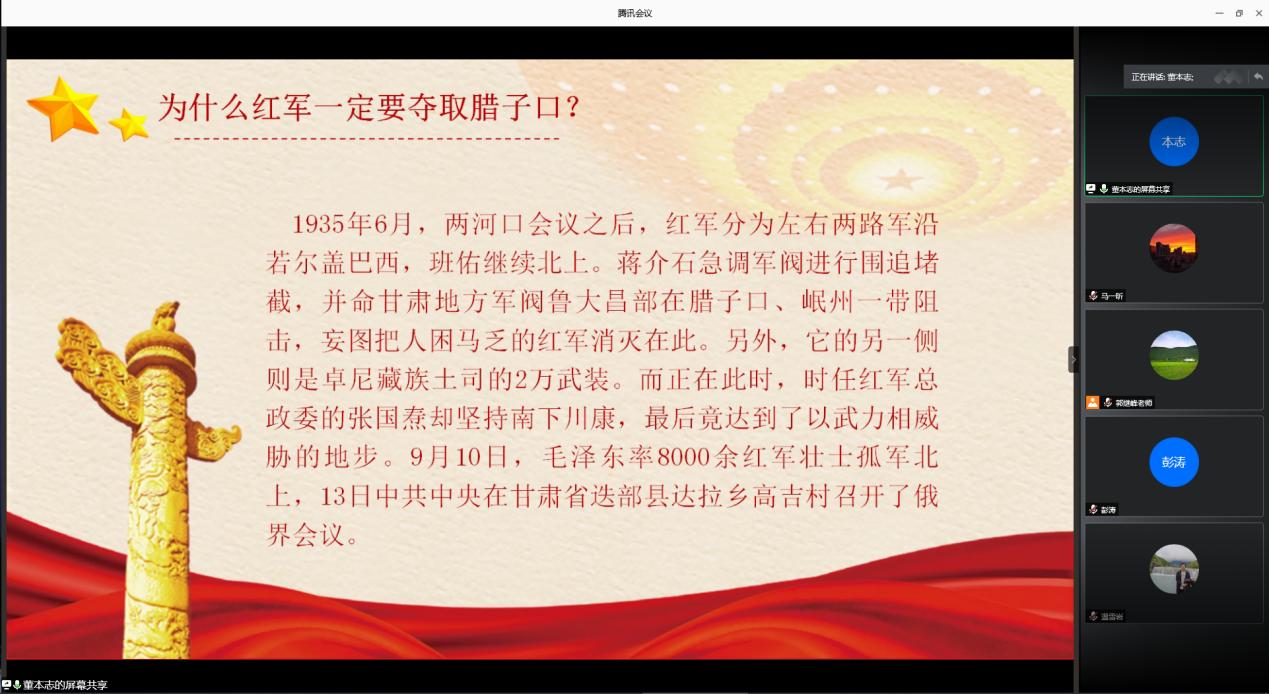 支部在10月中旬和下旬分两次完成了按主力红军长征路线分配图分配支部内党员讲长征故事的活动。在同志们的充分准备下,一批批生动鲜活、感人至深、催人奋进的文字、图片、音视频浮现在我们的眼前。这些史料详细的记录了红军战士们同人民同甘苦、共患难的感人故事;记录了决定红军的命运、前途的重大战役和会议,每一位党员同志的讲解都打动着我们的心灵,让我们深深的感觉到红军先烈对信仰的不懈追求。支部党员同志们边讲解,边讨论,细细体会当时艰辛的场面,取得了巨大的收获。