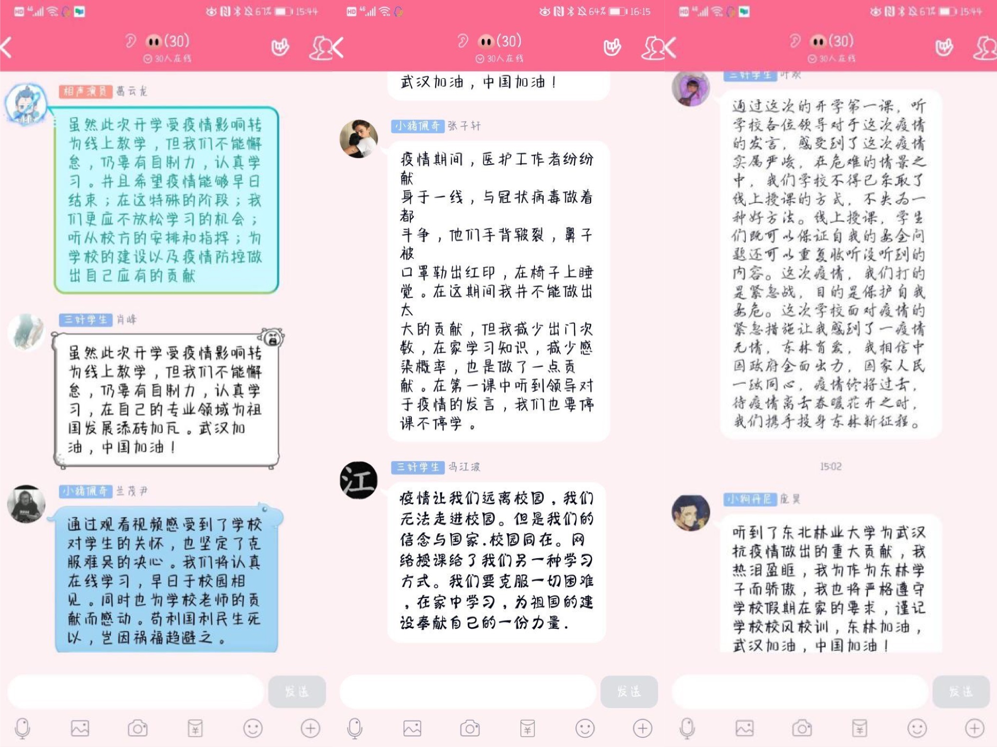 2016级信息管理与信息系统2班罗玉溪同学说:今天下午2点,我准时参加了公司以网络直播的形式召开的春季学期“开学第一课”。作为青年员工,我们是国家的后备力量,我们要相信祖国,相信自己,从小事做起,让我们一起携手抗击疫情,努力学习,为中国的富强尽一份自己的力量。在家准时上线收听公司安排的直播课程,按时完成学业,严于律己,养成良好的学习习惯。相信我们一定能战胜疫情,因为我们不仅背后有党和国家作为我们坚强的后盾,还有许许多多为疫情奋战的医护人员,和一群群的志愿者们,我向他们致以崇高的敬意!战胜病魔,我们一起加油。愿所有的幸福不负归期,愿所有的美好如期而至。愿前线英雄早日归来,愿疫情早日得到控制。武汉加油!中国加油!