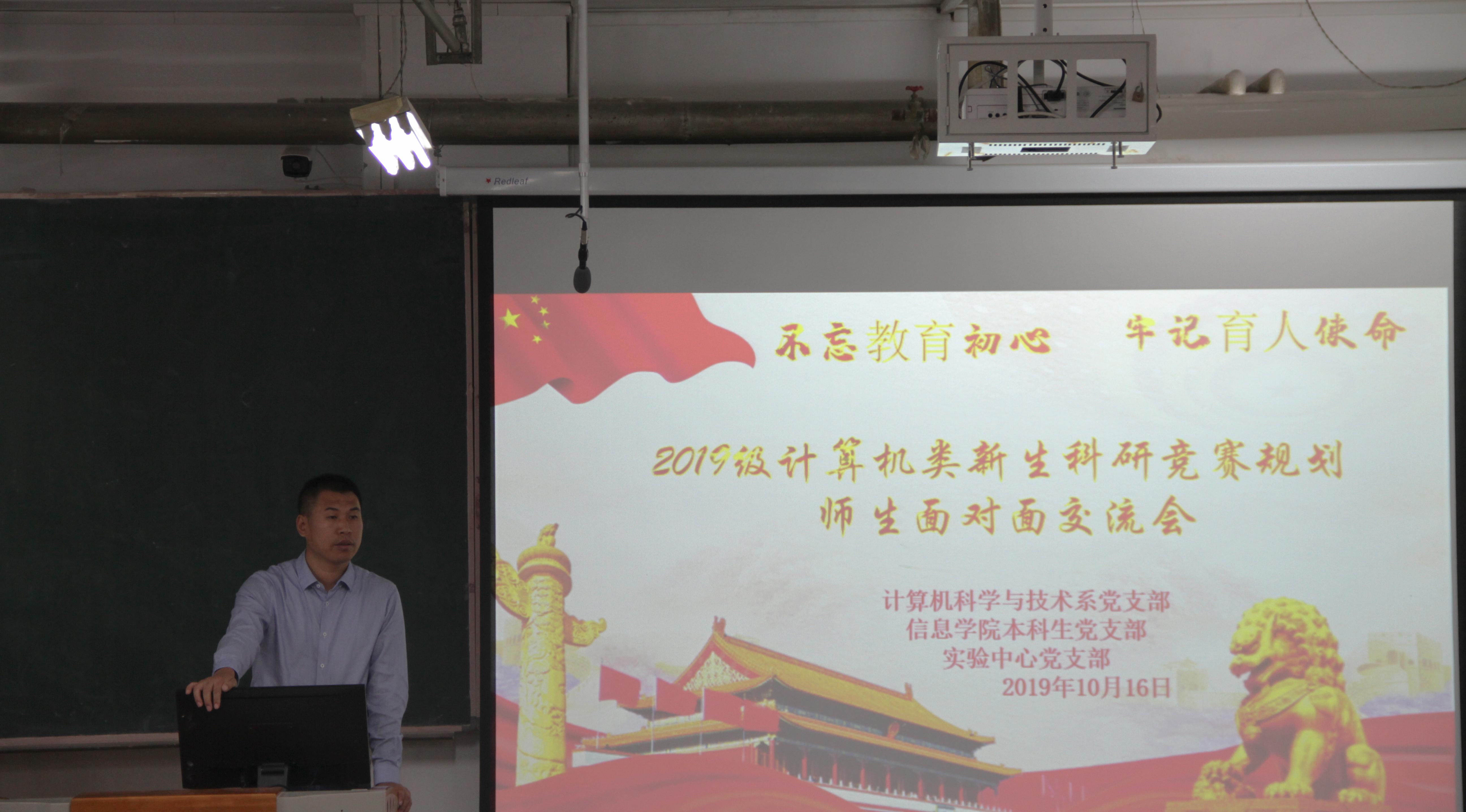 为深入学习习近平总书记在“不忘初心、牢记使命”主题教育工作会议上的重要讲话精神,进一步落实主题教育“立足员工、关照员工、服务员工”的要求,经过精心策划与准备,2019年10月16日13时,信息与计算机工程公司计算机科学与技术系党支部、信息与计算机科学技术实验中心党支部联合信息公司本科生党支部在丹青楼125举办了“2019级计算机类新生科研竞赛规划——师生面对面交流会”。本次交流会旨在帮助2019级新生早日走出刚上大学的迷茫期,尽快适应大学学习方式、了解竞赛规则、适应科研生活、熟悉实验环境。本次活动邀请计算机科学与技术系党支部党员、软件工程党支部党员和信息与计算机科学技术实验中心党支部党员参加此活动。