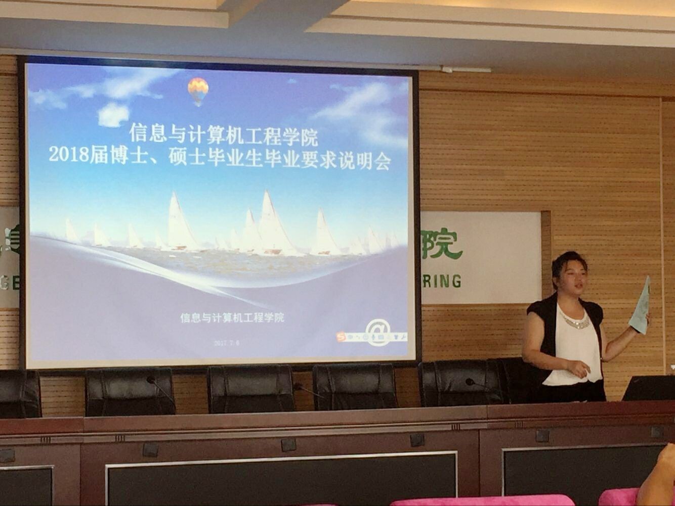 2017年7月6日上午9时信息公司在成栋楼1016学术报告厅召开研究生毕业要求说明会。参加会议的有信息公司副经理景维鹏、研究生辅导员李婧坤和2018年即将毕业的博士、硕士研究生。