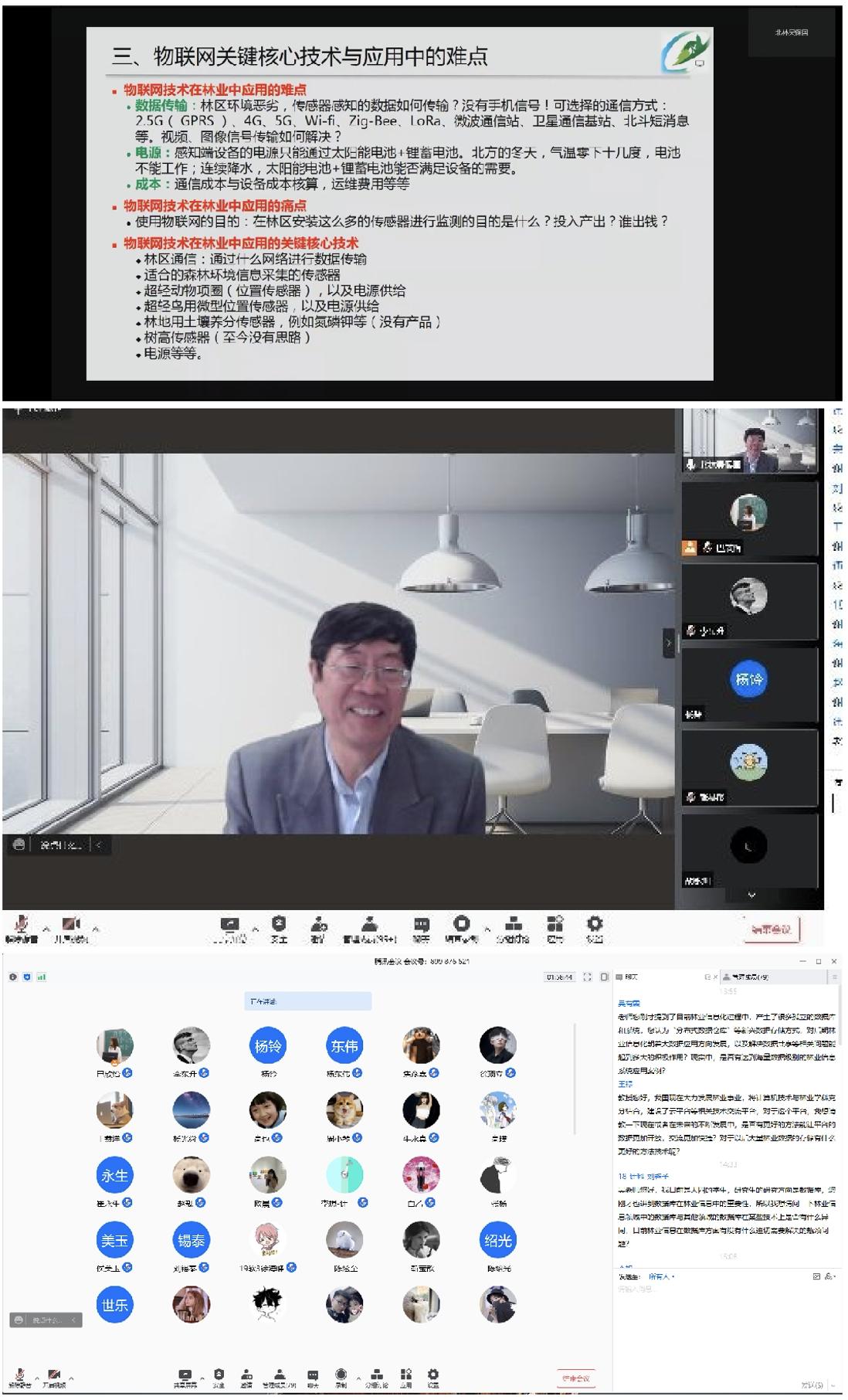 11月3日下午13:30,第一期活动通过腾讯会议平台顺利开展,活动邀请到北京林业大学吴保国教授作题为《林业信息化的关键技术与难点》专题报告,160余名员工参加会议。