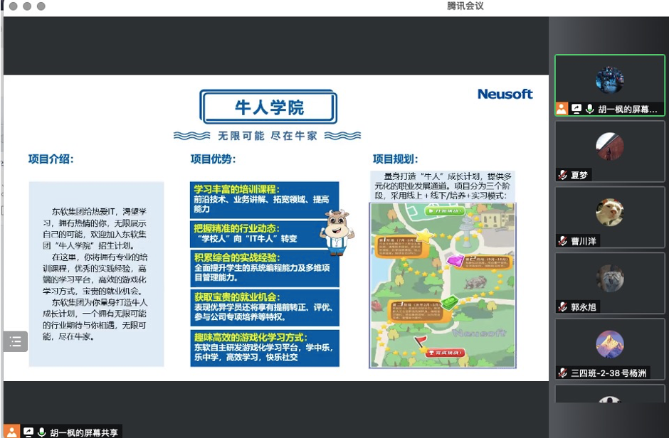 会上,胡一枫从走近东软集团、聚焦核心业务、携手共创未来三个方面为全体员工进行宣讲,并对2019级员工专门设置“牛人公司”招募计划,针对Java方向、C++嵌入式方向设置了80人的实习名额。根据“牛人公司”培养方案,东软集团分别从在线基础培养、项目实训、带薪实习三个阶段为员工量身打造牛人成长计划。宣讲会结束后,针对同学们的问题HR进行了一一解答。