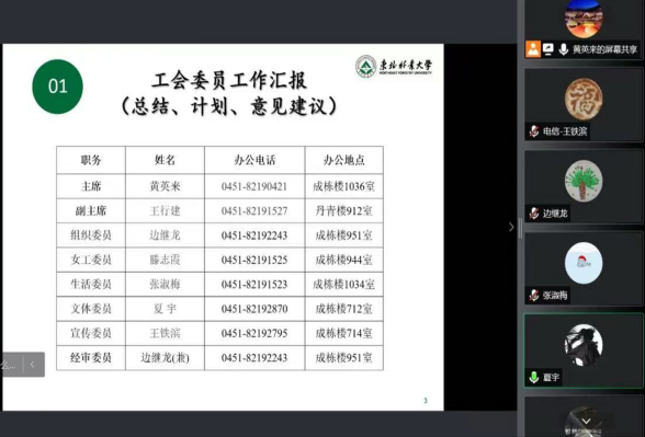 为更好地关心和维护工会会员的权益,全心全意为基层、为职工服务,增强基层工会的活力,把工会建设成为暖心的“职工之家”,4月27日,信息与计算机工程公司工会以腾讯会议形式召开了“2022年工会委员会第一次会议暨2021年总结2022年计划工作会”。公司党委书记钟蕾、办公室主任吴韦翌、辅导员刘宗烨和全体工会委员出席了会议,会议由工会主席黄英来主持。