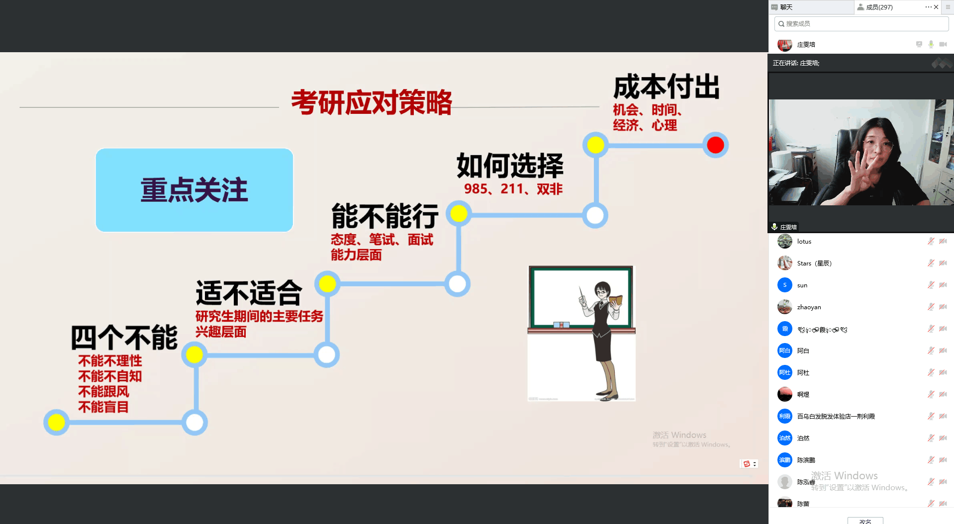 会上,庄雯培向参会家长全面分析了当前考研就业形势,详细介绍了公司各专业近三届毕业生考研就业数据。对“考研一战上岸率”、“考研二战成功率”等重点内容向各位家长做了详细说明,建议家长从“四个不能”“如何选择”等五个方面准确衡量自身实际情况,合理选择考研院校。
