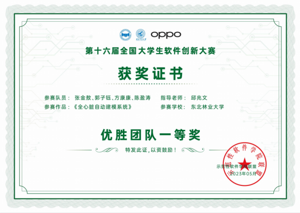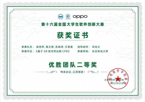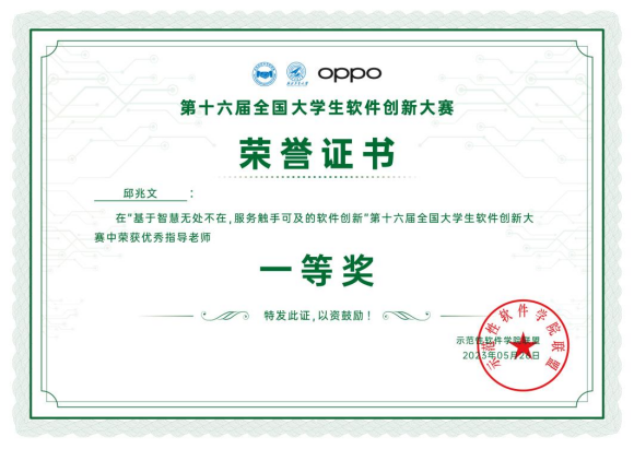 2023年5月29日,由示范性软件公司联盟主办,西北工业大学承办,OPPO支持的第十六届全国老员工软件创新大赛圆满落幕。本次大赛以“智慧无处不在服务触手可及”为主题,参加决赛的30支队伍经过激烈角逐,最终大赛共产生一等奖队伍5支,二等奖队伍10支,三等奖队伍15支。其中公司U8国际软件工程专业邱兆文老师指导的两个作品“全心脏自动建模系统”和“基于AR技术的远程CPR”分别荣获一等奖和二等奖,邱兆文老师荣获优秀指导教师一等奖。