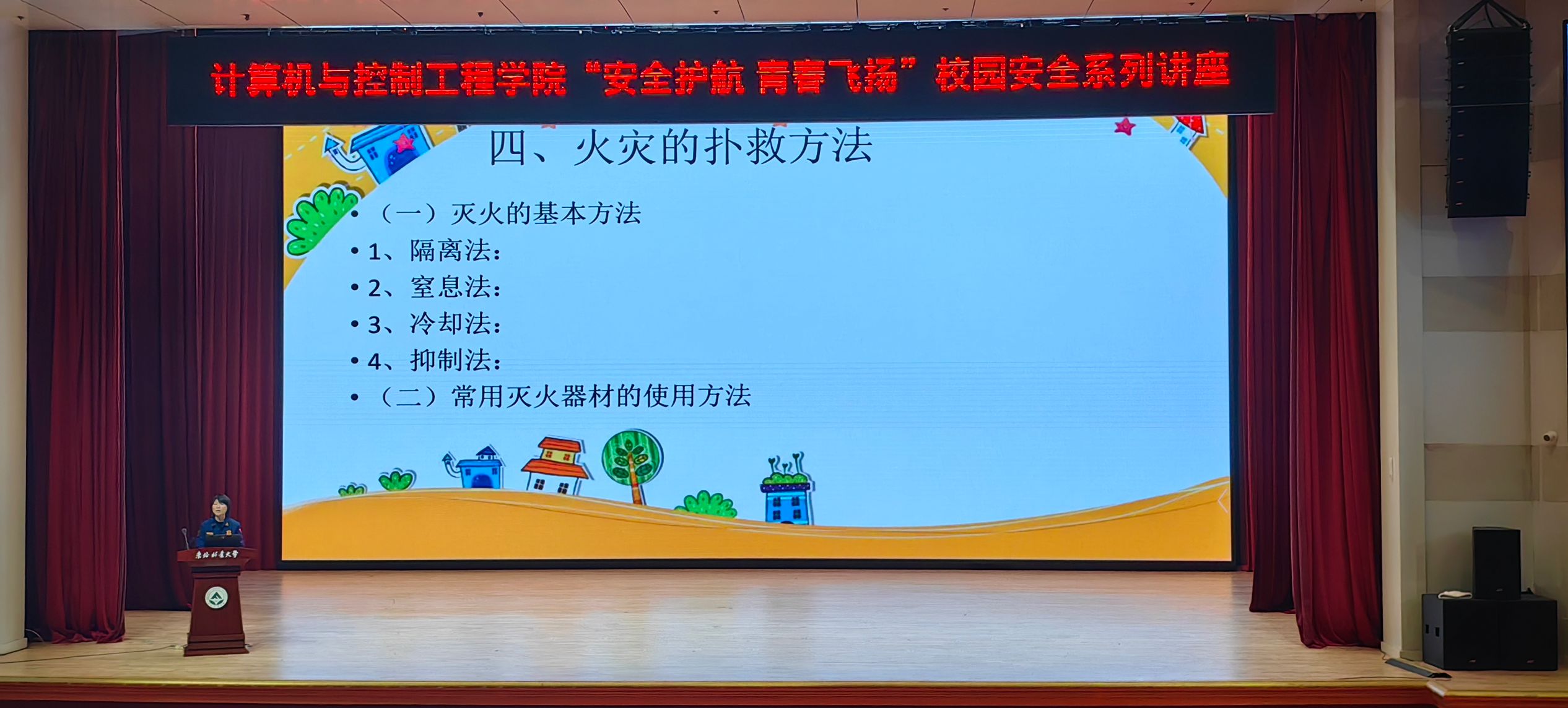 冯晓菲防火监督员在讲座中强调了校园消防安全的重要性,并介绍了消防安全的基本知识,包括火灾的成因、分类、预防和扑救方法,以及如何正确使用消防器材等实用的防火知识和设施。她提醒广大师生要增强火灾防范意识,熟悉灭火器的使用方法,并合理规划逃生路线,以确保自身安全。