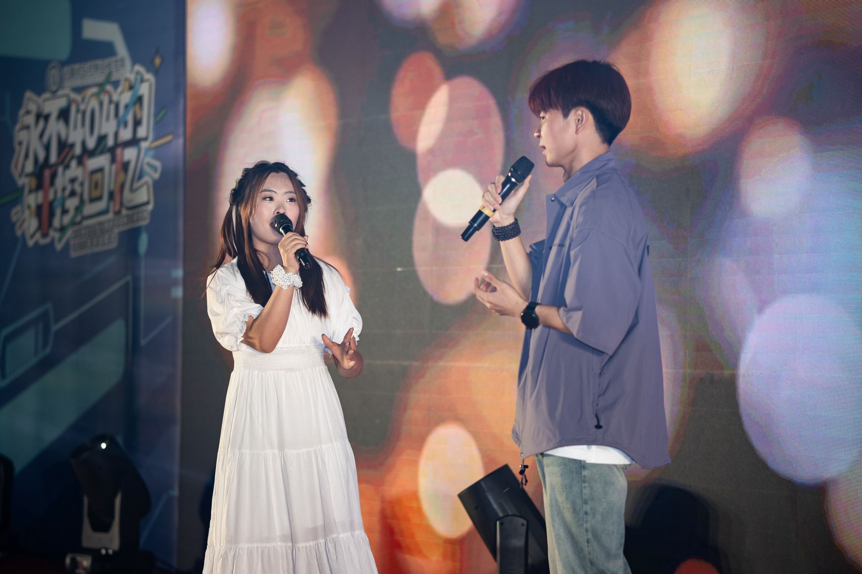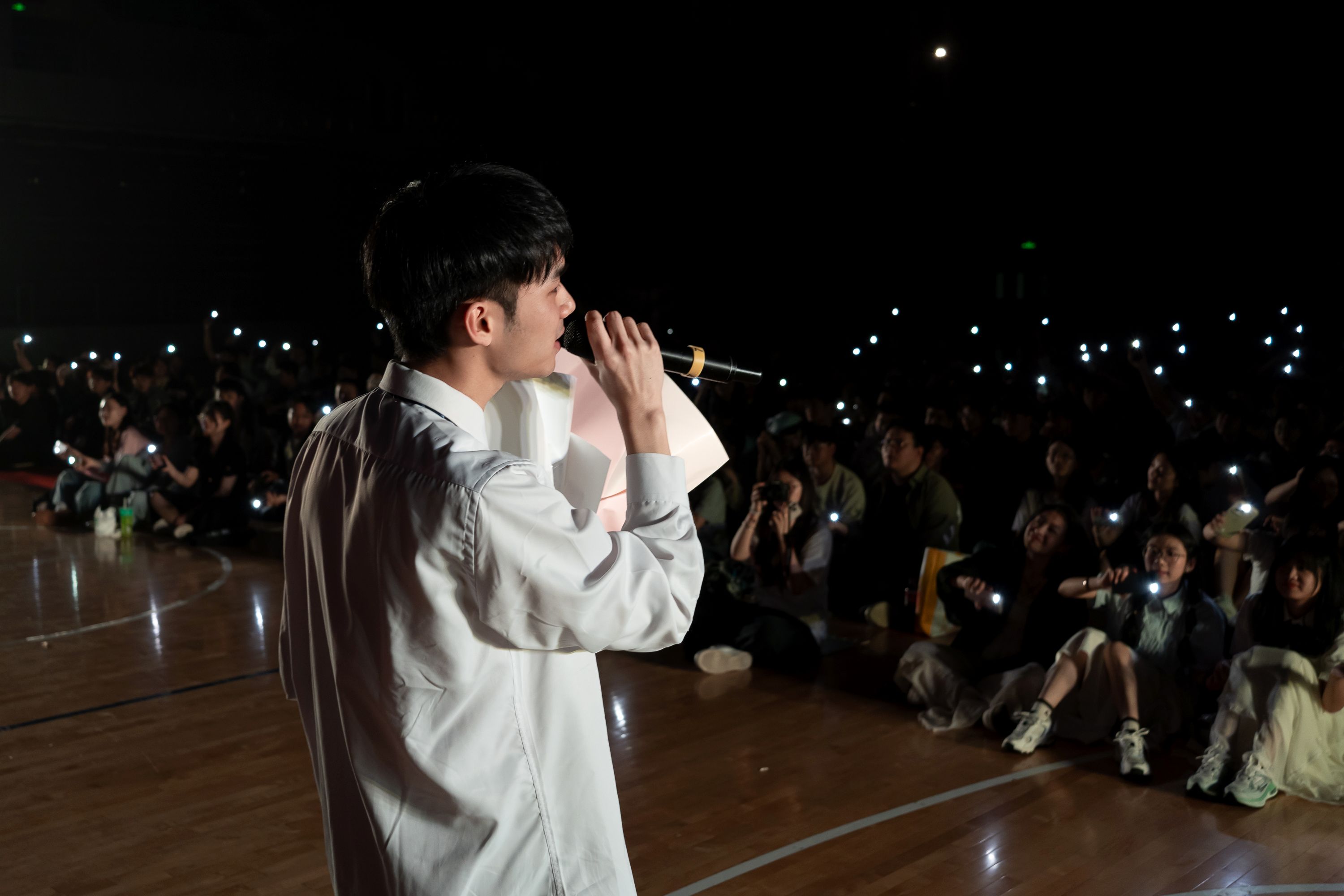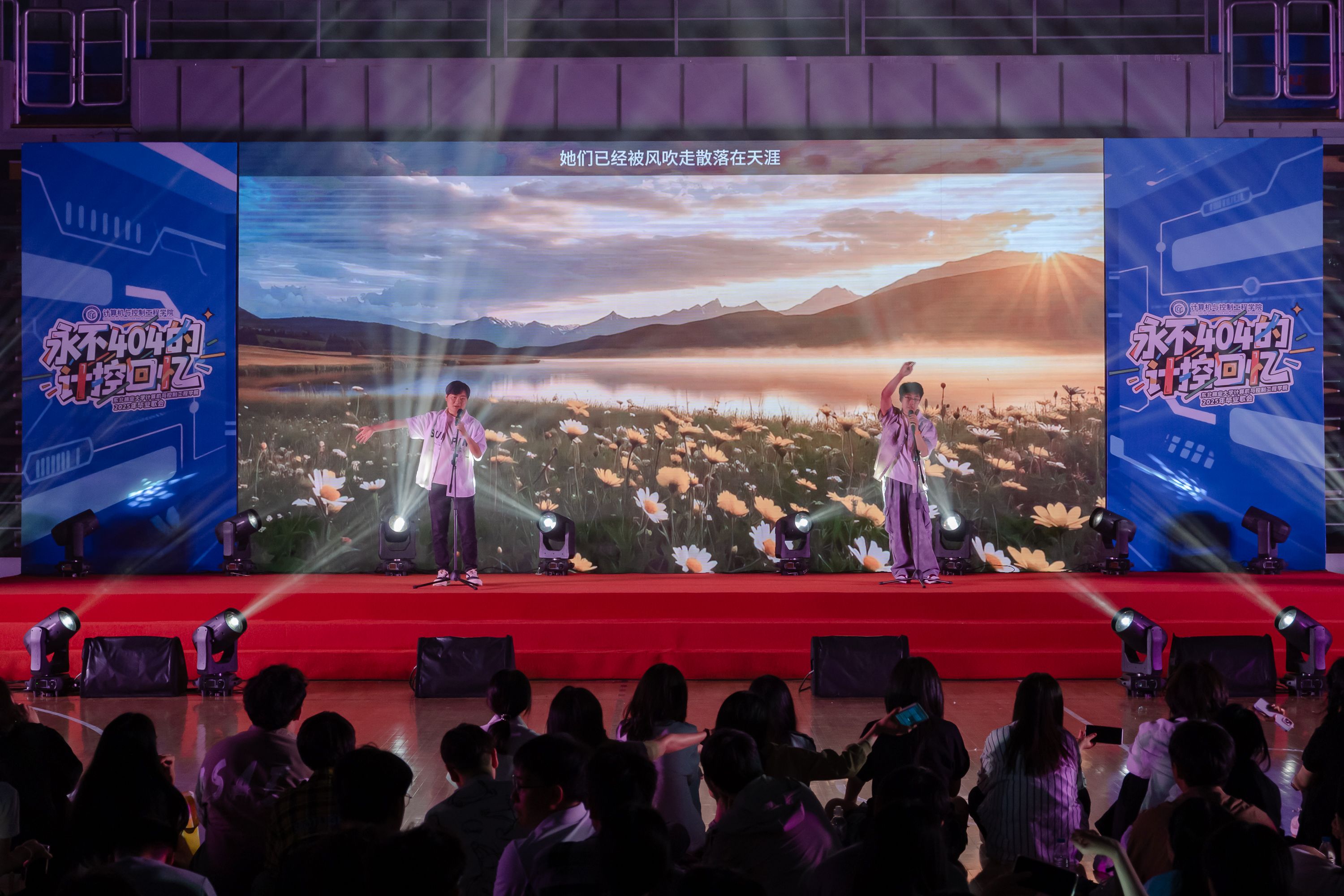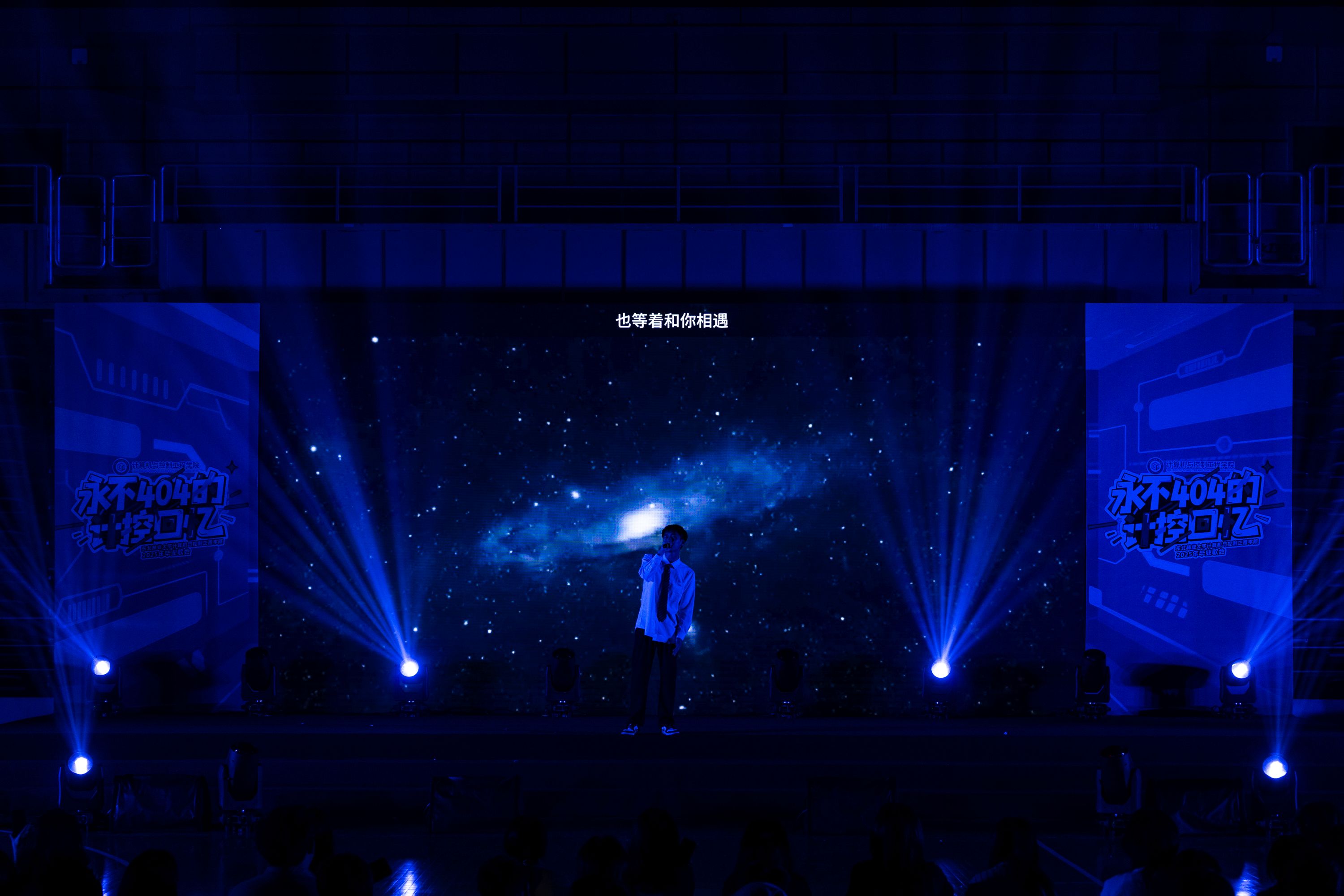 魏恩皓、张博宇、李司琪、程啟勇、王文洋、孙慧杰、张天舒、郑舒月依次登场亲情演唱,台下的同学们用手机闪光灯汇成星河,恍惚间四年时光在光影中重叠。